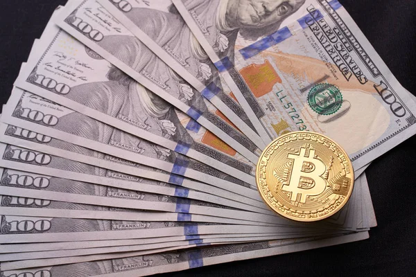 Goldmetall Bitcoin Auf Dollarscheinen Hintergrund Viel Geld In Bar 100 Dollar Lieber Bitcoin Goldmunze Gewinn Aus Dem Bergbau Netzwerk Banknote Stock Photo 206196808